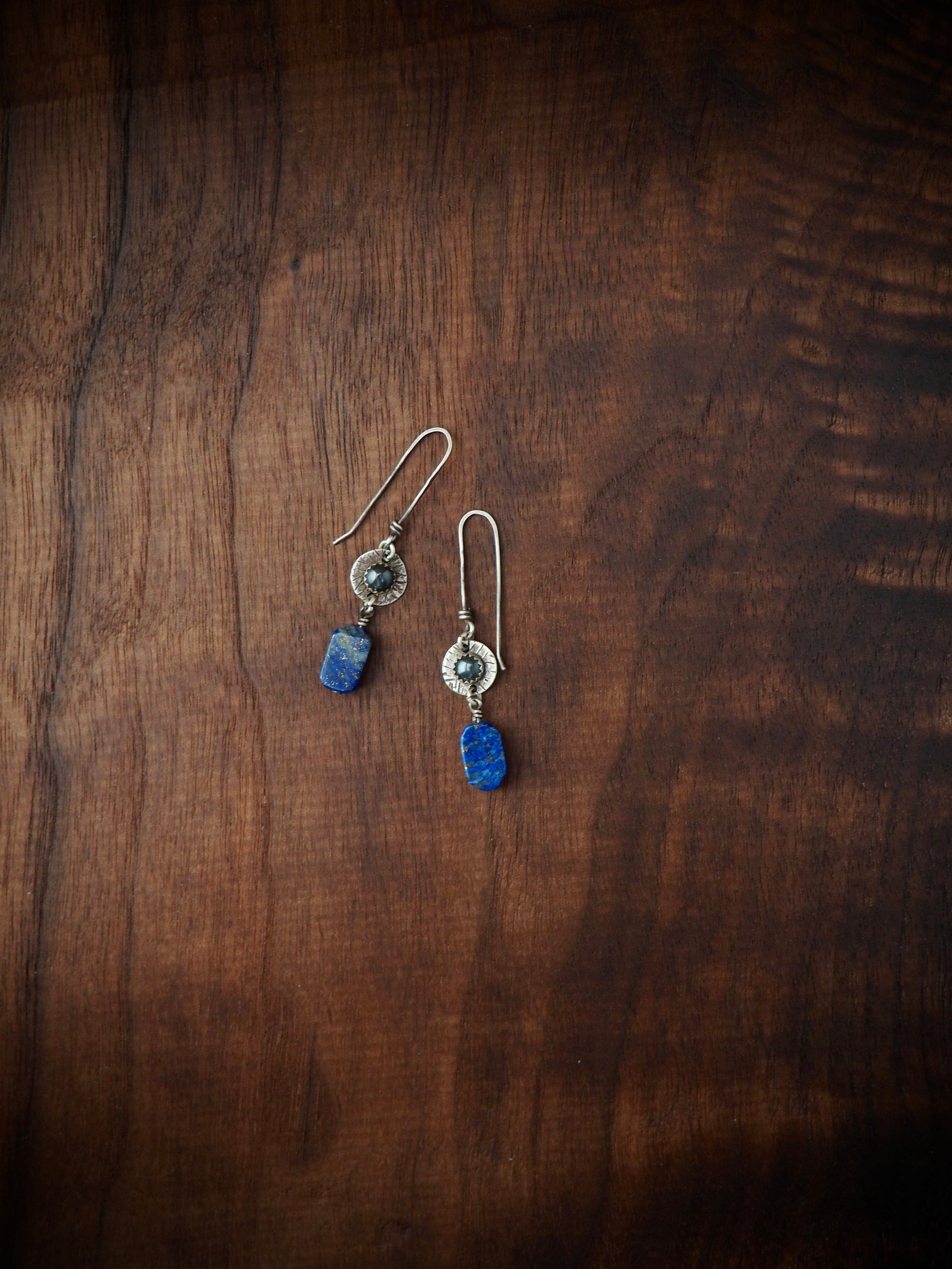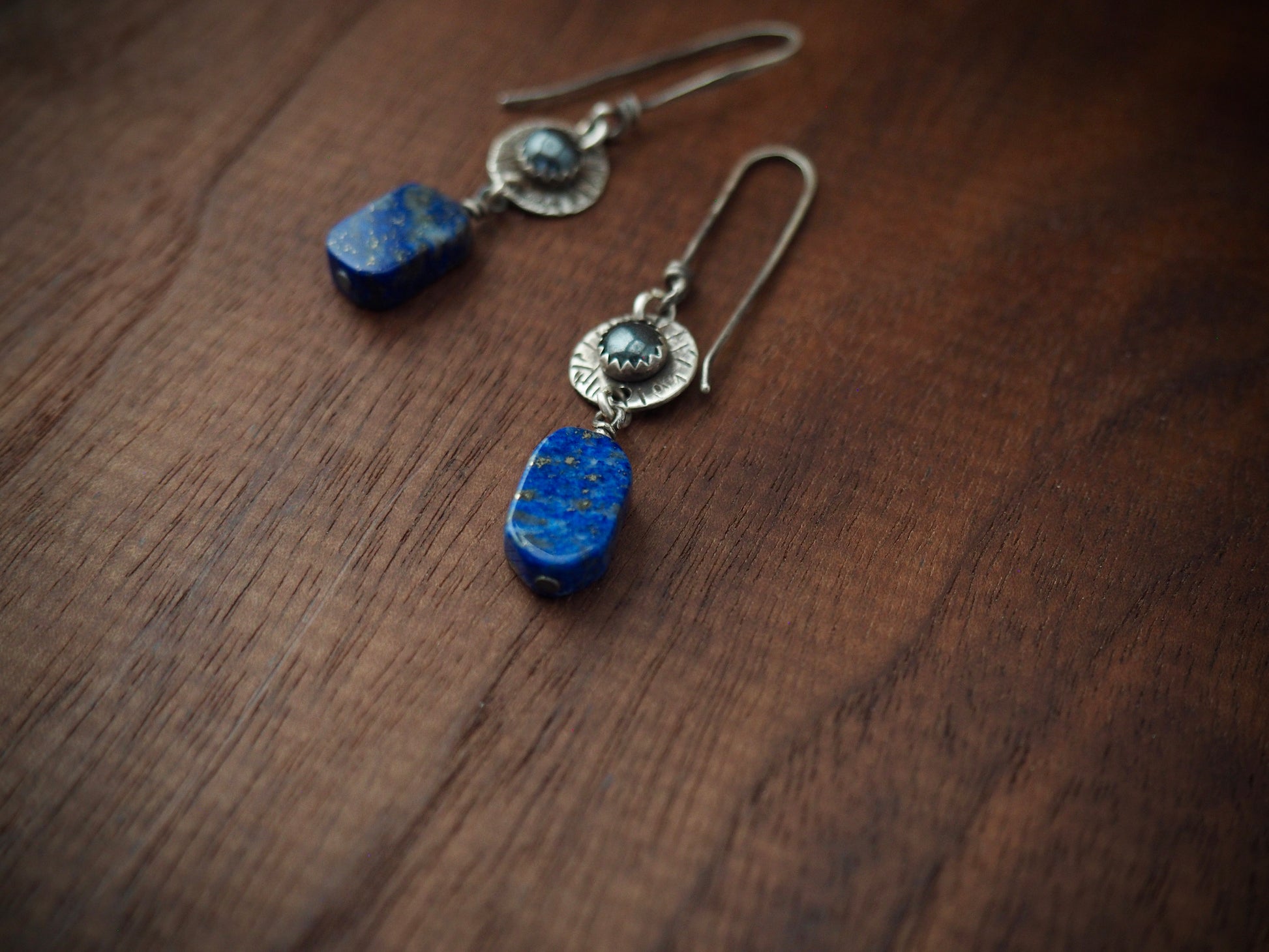 I selected the stones in this pair of earrings, as a blend of my reflections seeing (and learning about) the glacial lakes and exploring the mining ruins in the mountains of Ouray, Colorado. This pair features: Polished Blue Lapis, bezel-set Hematite, and Sterling Silver crafted ear-wires + components.
