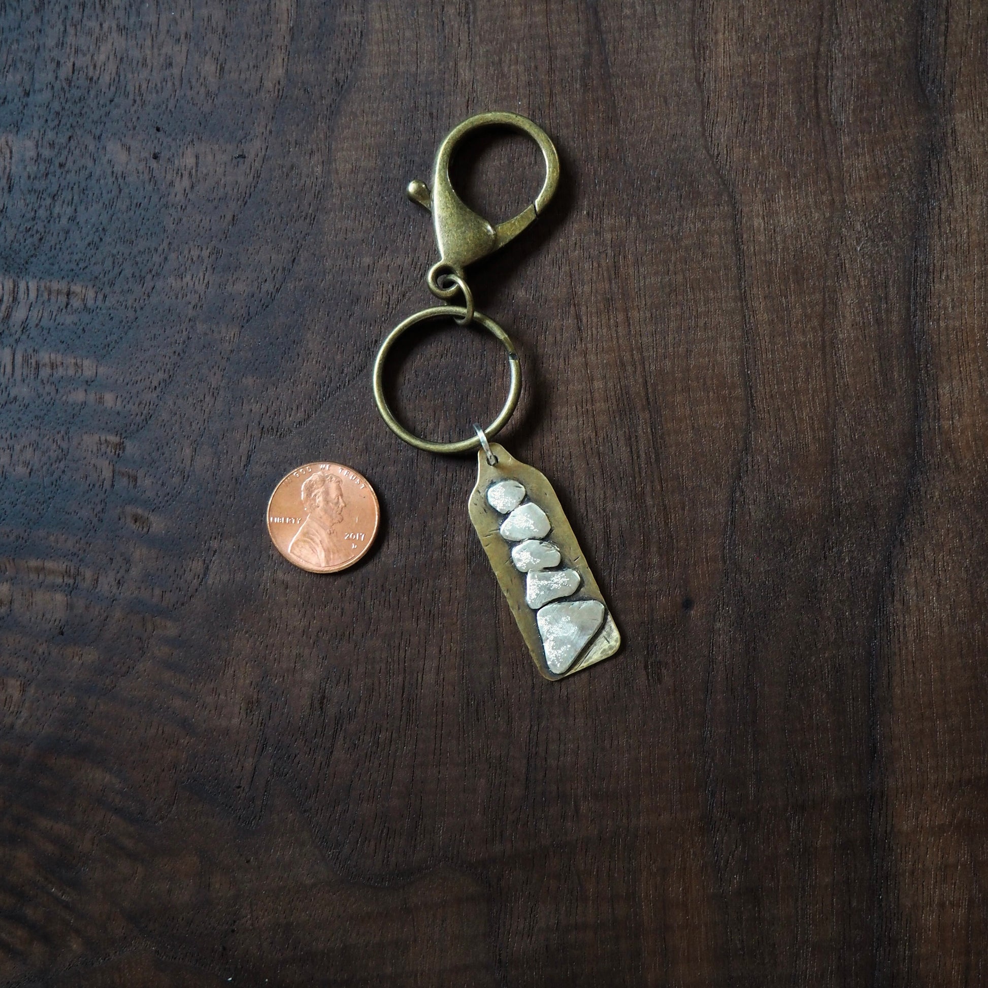 These cairns are crafted from Sterling silver “stones”, each carved and textured by yours-truly, then soldered to a brass backplate!