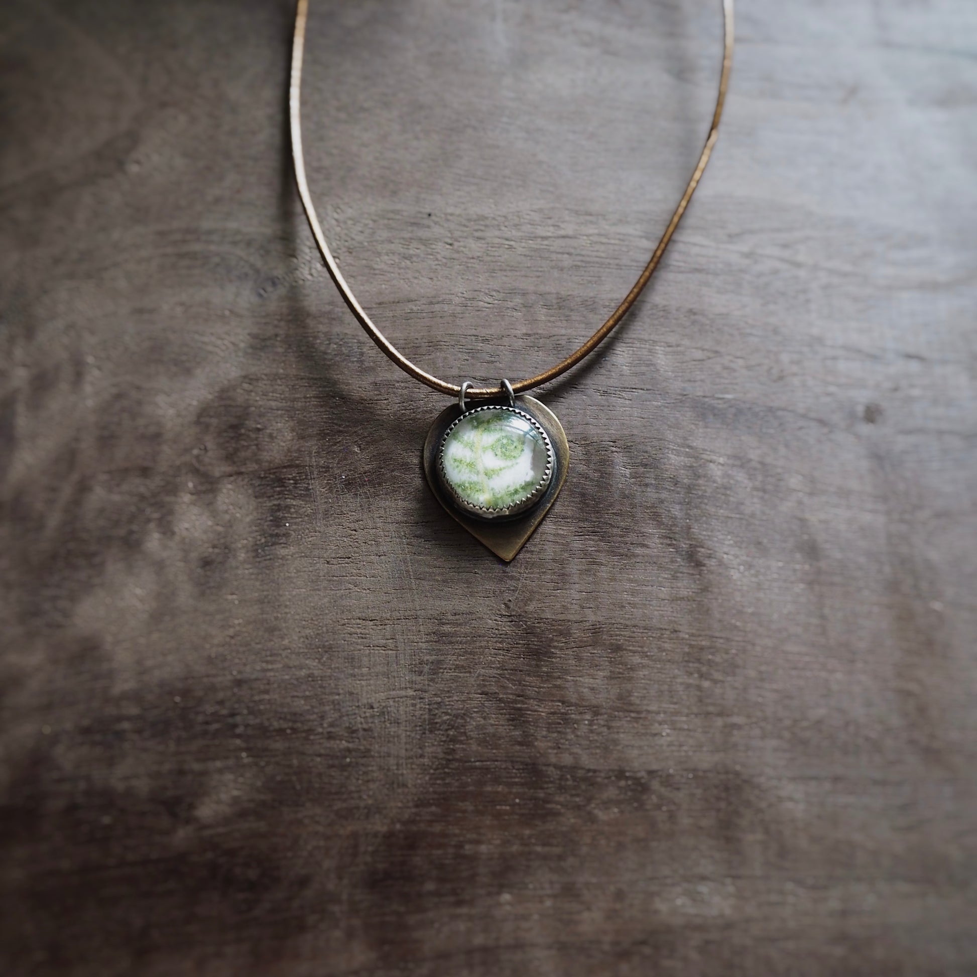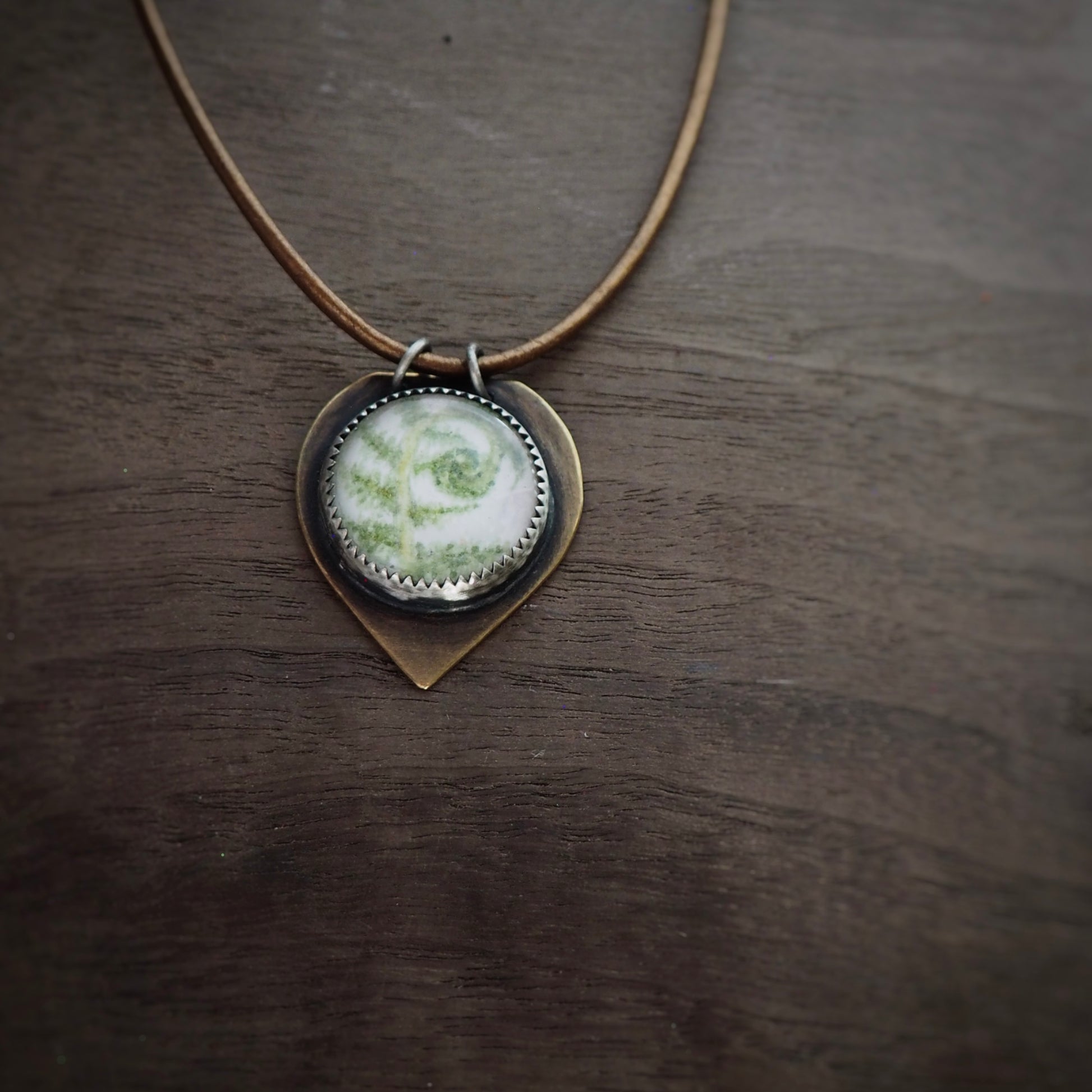 Set in hand-fabricated sterling silver bezel and soldered to a brass “backplate”