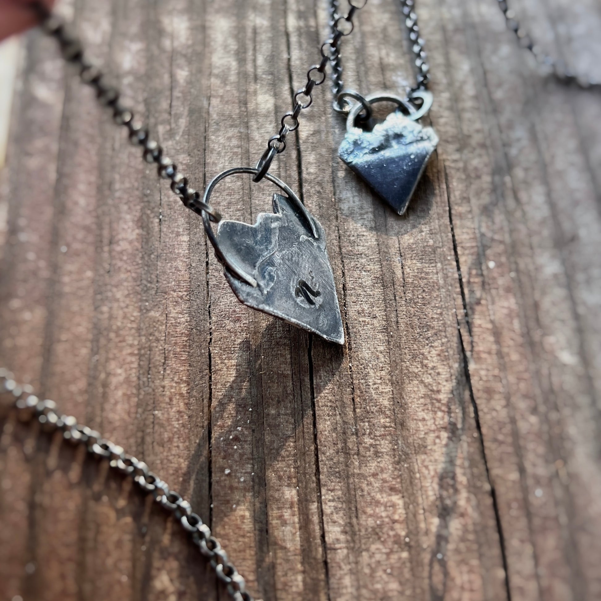 This sterling silver, diamond-shaped pendant features a top portion sculpted into a mountain scape, impressed with crumbled sandstone collected from the red mountain ranges of Colorado and Utah. At the base a hand-sculpted tiny evergreen tree 🌲Â
