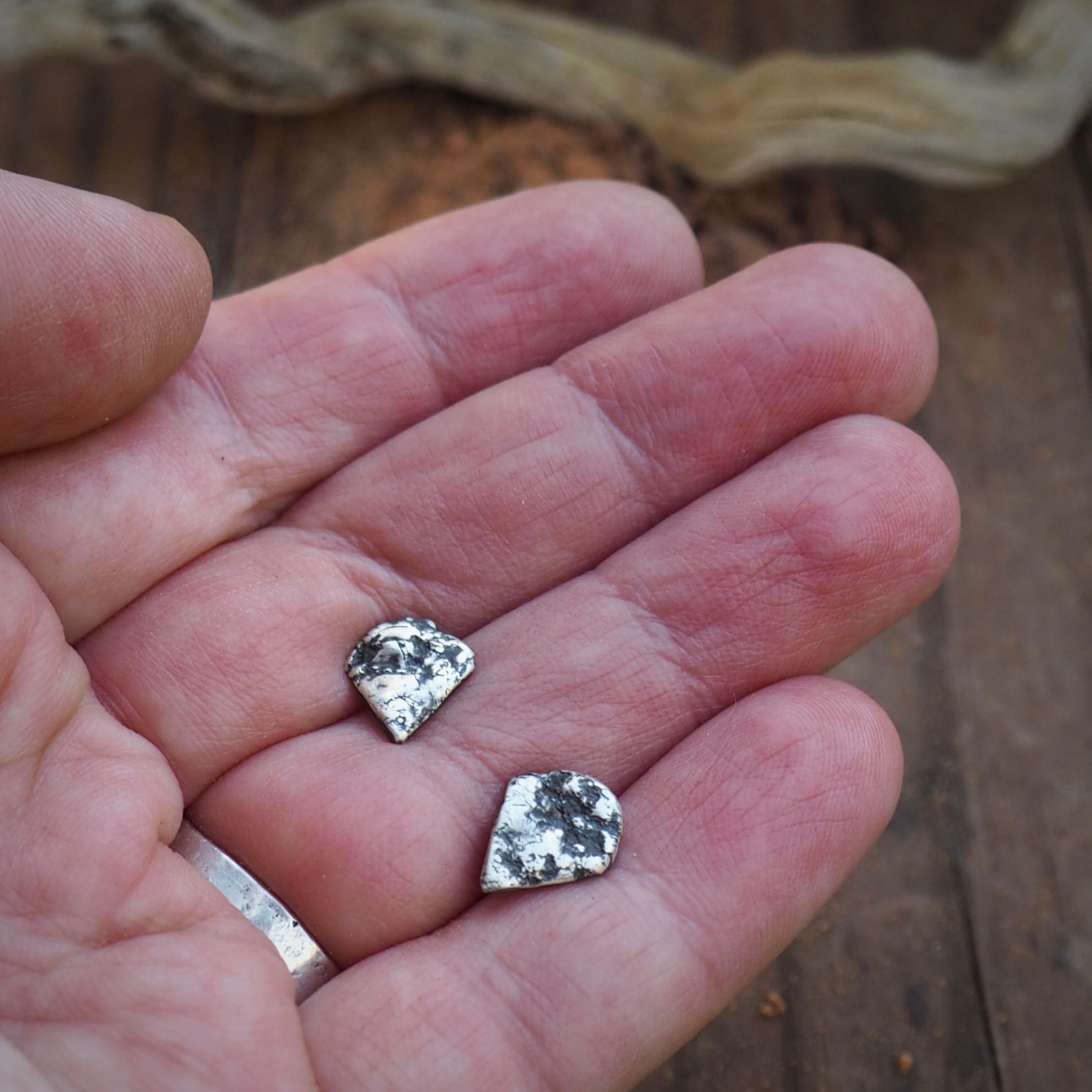 Earthy sterling silver studs textured with impressions of real Colorado sandstone, carrying the raw and rugged spirit of the mountains in a wearable form.