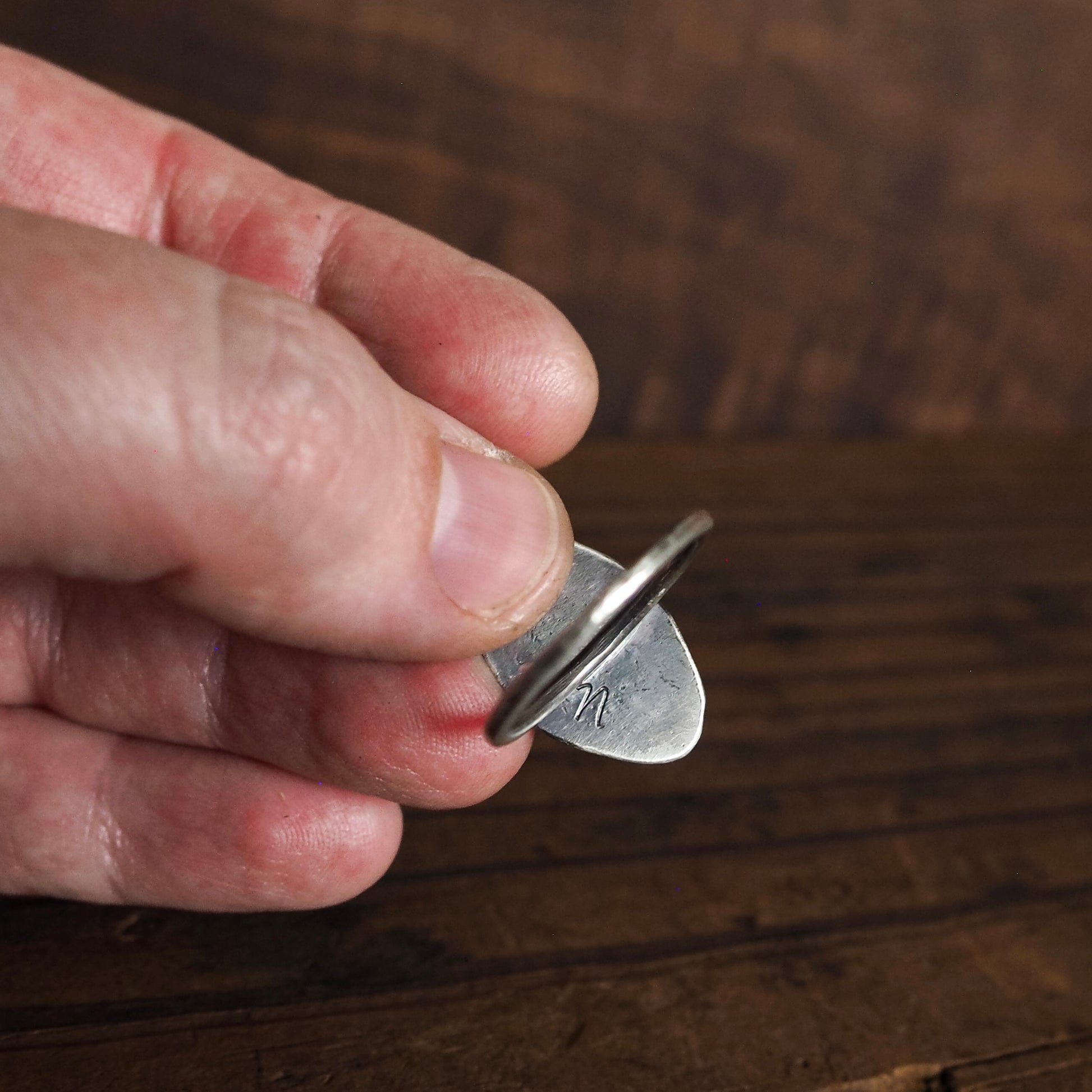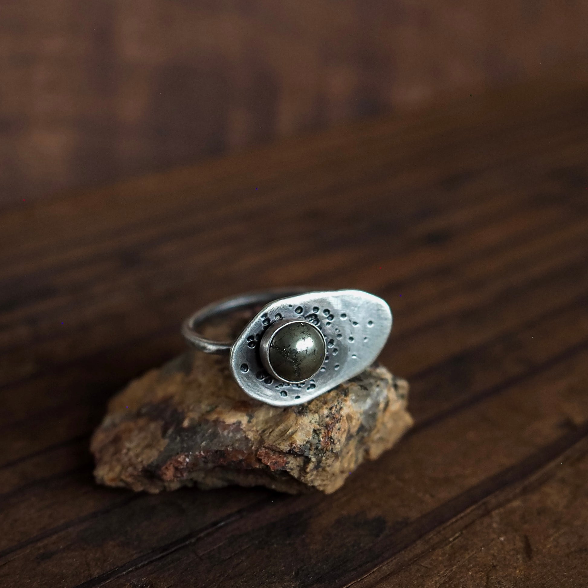 Part of the Stone Toss series, each is designed with an organic approach, down to the finish of the ring band itself. The series comes from childhood memories of the mesmerizing water ripple after tossing and skipping stones in the ocean. No ring is the same in this series, with this one featuring a ronus pyrite stone! Check the shop to see all unique pieces in this series available.