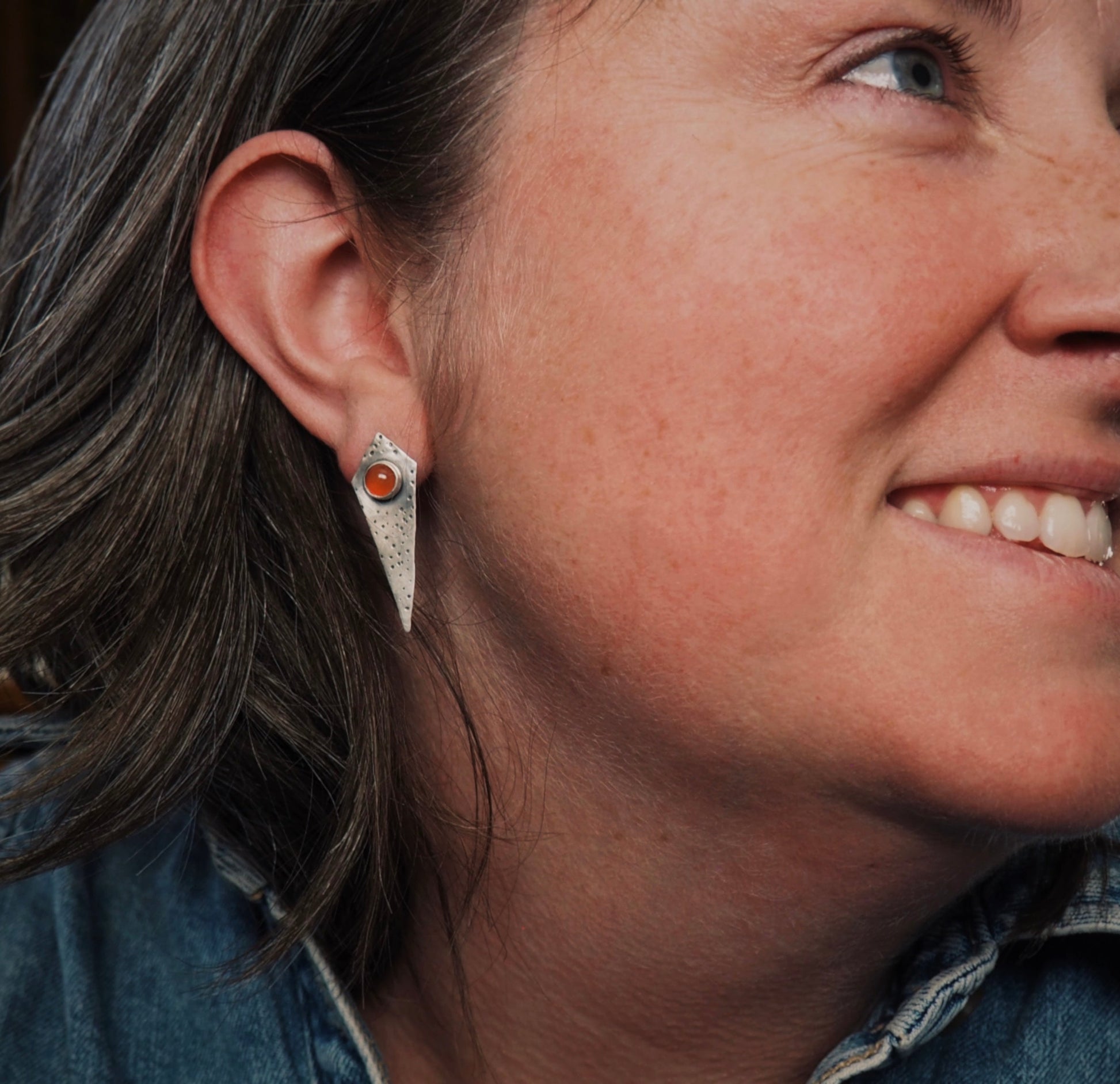 Handcrafted in sterling silver with organic texture and subtle edge — a reminder to trust our own sense of direction. Each pair is one-of-a-kind, with this pair celebrating the Autumnal warmth of natural carnelian. Each pair reflecting quiet confidence that comes from finding your own way!